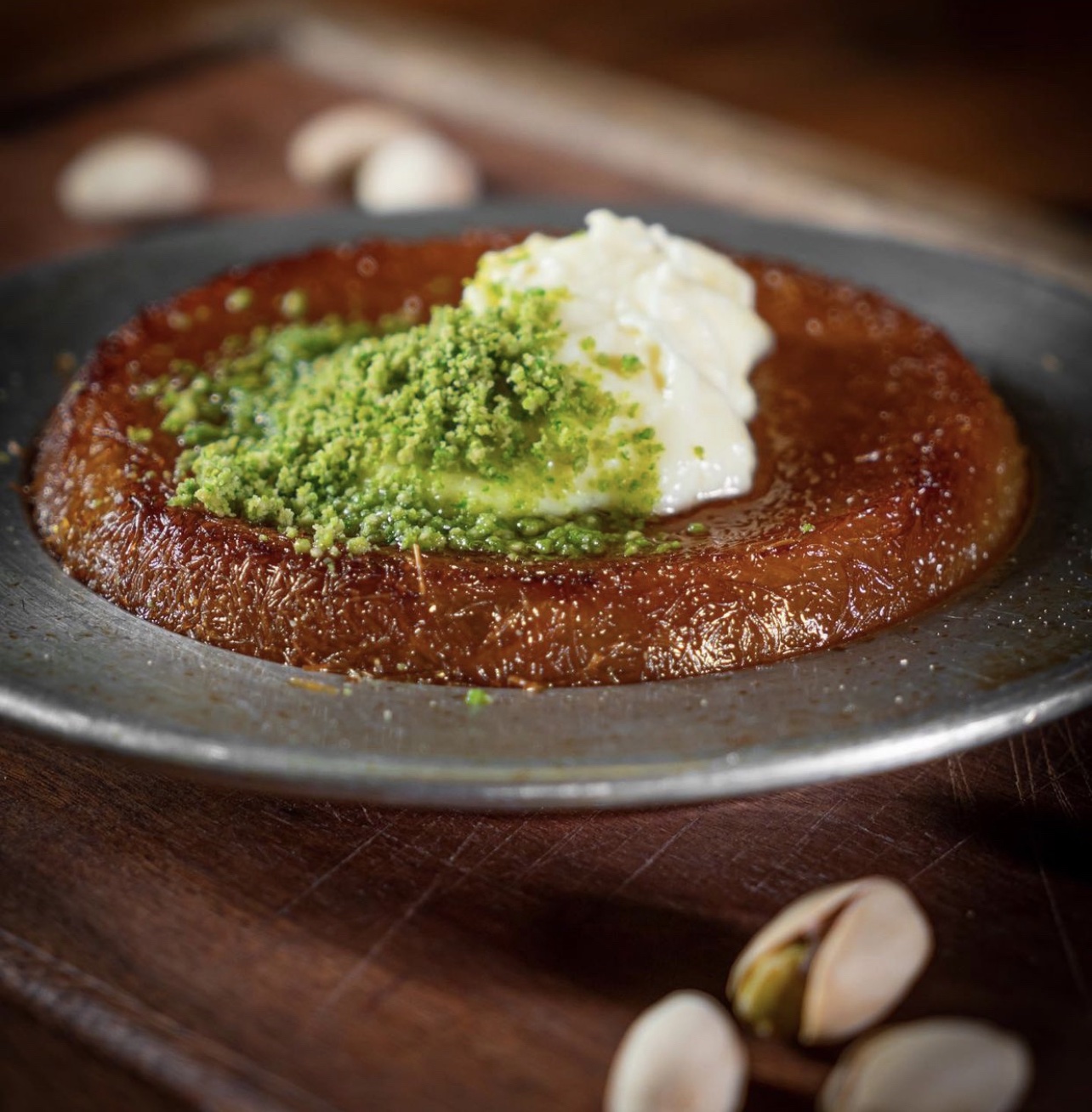 Warme Süßspeise aus Fadennudeln mit Käse, Sahne und Pistazien